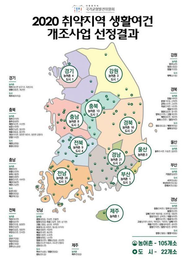 대통령 직속 국가균형발전위원회는 2020년 취약지역 생활여건 개조사업 신규 사업대상지 127개소를 선정했다고 밝혔다.