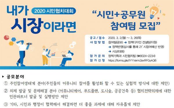 평택시가 오는 26일까지 2020년 시민협치대회 ‘내가 시장이라면’의 시민과 공무원 참여팀을 모집한다.