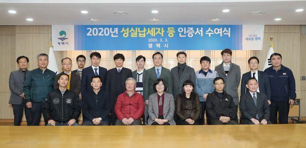 평택시는 납세자의 날을 맞이해 지방세를 성실하게 납부하며 시 재정확충에 기여한 납세자를 우대하고 사회적으로 존경과 우대를 받을 수 있는 토대를 마련하고자 법인 에스피엘㈜ 등 6곳과 개인 8명을 ‘2020년 평택시 우수납세자’로 선정해 인증서를 수여했다.