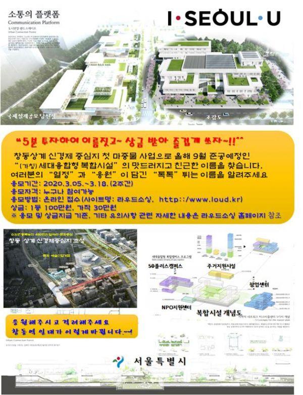 서울시는 5일부터 오는 18일까지 지역경제 활성화를 위한 사업으로 창동역 역세권 일대 부지에 건립중인 ‘동북권 세대융합형 복합시설’에 대한 이름을 공모한다고 밝혔다.