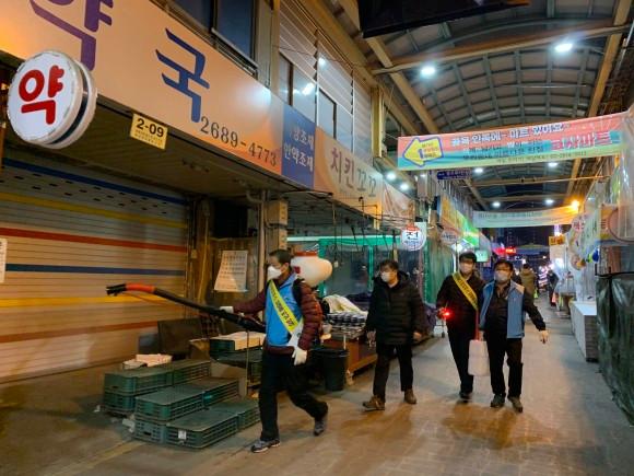 광명시 광명6동 행정복지센터는 코로나19 확산을 방지하고자 지난 3일 저녁 새마을 시장에서 야간 특별 방역을 실시했다.