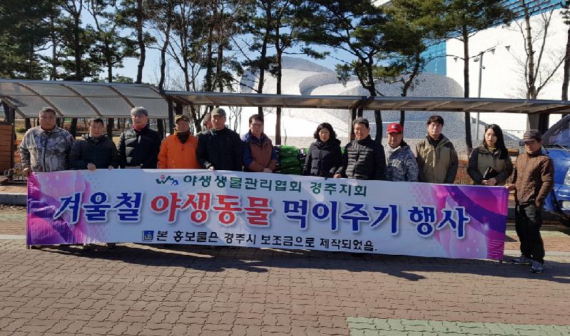 경주시는 24일 (사)야생생물관리협회 경주지회, 경주국립공원관리사무소와 함께 동절기 야생동물 먹이주기 행사를 가졌다. 동절기 야생동물 먹이주기 행사는 한파로 먹이가 부족한 야생동물의 도심출현으로 인한 재산피해와 시민들의 불안감을 해소하고, 야생동물 보호 및 자연생태계의 보전을 위하여 매년 실시해 오고 있다. 이번 행사에서는 동물사료 1,300kg을 어래산, 오봉산, 인내산 등 야생동물의 서식지와 이동 통로에 뿌렸다. 시 관계자에 따르면 “겨울철 야생동물에게 먹이를 줄 때는 사람들의 통행이 적은 숲 안쪽에 살포해야 하며, 특히 사람이나 화학냄새가 나지 않도록 마른 땅 또는 돌 위에 먹이를 조금씩 놓아 주어야 제대로 먹이를 취할 수 있다”고 전했다. 한편 시는 야생동물 보호를 위한 밀렵행위 근절 홍보와 단속활동도 지속적으로 전개할 방침이라고 밝혔다. 박효철 환경과장은 “현재가 동물들의 먹이가 가장 부족할 시기인데 사람들의 통행 및 열매 채취로 인해 먹이가 더욱 부족하다”며 "먹이를 주는 것도 중요하지만 밤, 도토리 등 채취를 자제하는 것이 더 중요하다”고 당부했다.