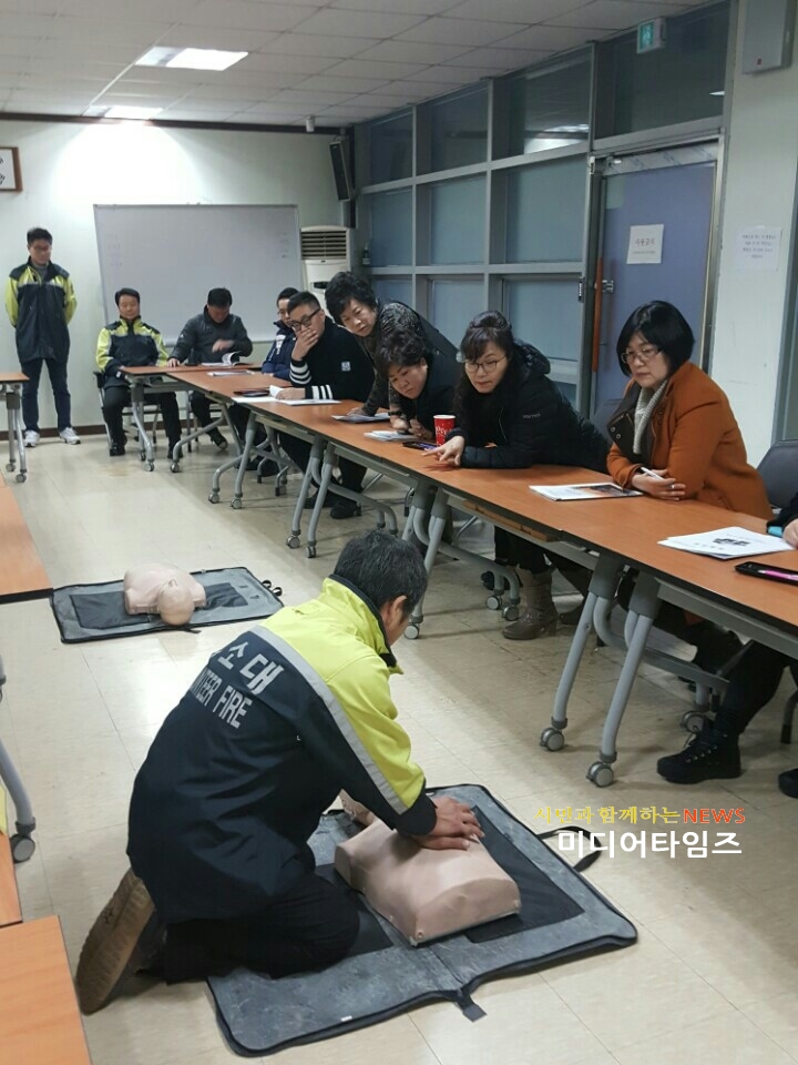 [미디어타임즈=홍기연 기자] 인천서부소방서(서장 김준태) 경인아라뱃길 자전거순찰 전문의용소방대원(김인덕 대원 등 15명)은 28일(화) 검암동에 위치한 검암경서주민센터에서 주민 및 관계자 50명을 대상으로 심폐소생술(CPR) 및 응급처치 교육을 실시했다. 주요내용으로는 ▲ 심폐소생술 실시요령 시범 및 실습 교육 ▲ 자동제세동기 사용방법 ▲ 기도폐쇄 응급조치 등에 대한 이론 교육과 실습 교육으로 진행됐다.특히 실제 응급상황에서 즉각 대처할 수 있도록 교육용 마네킹을 활용한 현장감 있는 실습으로 교육 참가자 모두 위급한 상황처럼 진지하고 적극적인 자세로 교육에 임했다.정동원 의용소방대장은 “안전의 중요성이 대두되는 요즘 시기에 직접 주민을 찾아가는 의용소방대 119수호천사 심폐소생술 교육은 주민들의 반응도 매우 좋아 주민의 생명과 재산을 지키기 위해서 이러한 교육을 지속적으로 실시해 나갈 계획이다”고 말했다.