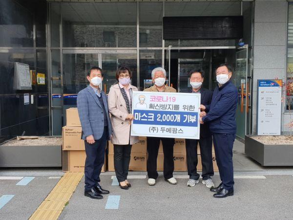 지난 3일 ㈜두메팜스에서 코로나19 확산방지를 위해 써달라며 마스크 2,000개를 일죽면사무소에 전달했다.