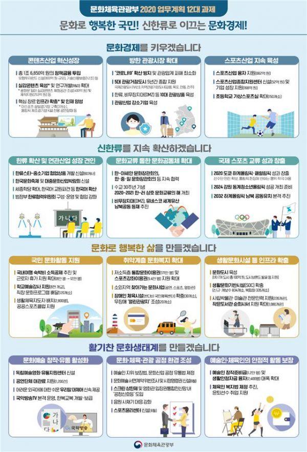 이에 문체부는 2020년 신한류의 확산, 관광산업 역량 강화, 2020 도쿄올림픽 등 국제 스포츠교류 성과 창출, 국민의 다양한 문화·여가 활동 지원, 영화·예술·스포츠 분야 등의 공정 환경 조성 등을 중점 추진한다.