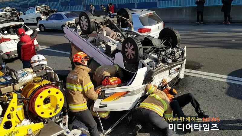 | 부평소방서 경인고속도로 3중 추돌사고 전복된 차량에서 1명 구조모습. <ⓒ미디어타임즈> |