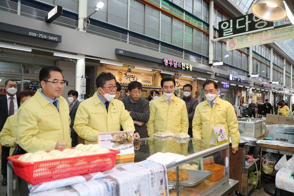 평택시와 평택시의회는 5일 코로나19로 어려움을 겪고 있는 소상공인들의 애로사항을 청취하고 지역경제 활성화에 힘을 보태기 위해 전통시장을 찾았다.
