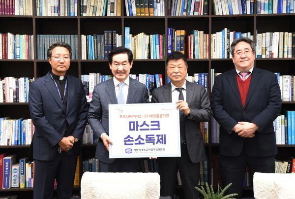 가톨릭대학교 의정부성모병원은 지난 5일 코로나19의 지역감염 예방을 위해 24시간 방역대책본부를 운영하고 있는 의정부시를 방문해 마스크 18,000장, 손소독제 300개를 전달했다.