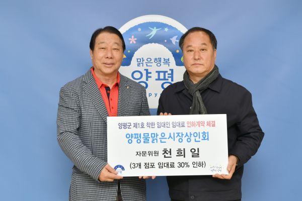 양평군 1호 ‘착한 임대인’은 양평물맑은시장상인회 천희일 자문위원으로 본인의 건물 3개 점포의 임대료를 3개월간 30% 인하하는 등 착한 임대인 운동에 적극 나서고 있다.