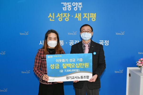 양주시는 지난 5일 경기교사노동조합에서 양주시청을 방문해 관내 교육복지 사각지대에 놓인 아이들을 돕는데 써달라며 성금 750만원을 전달했다고 밝혔다.
