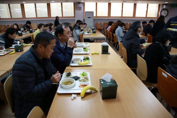 구내식당의 의자도 한 줄로만 배치해 직원들이 마주보고 식사하지 않도록 하는 사회적 거리두기를 실천하고 있다.