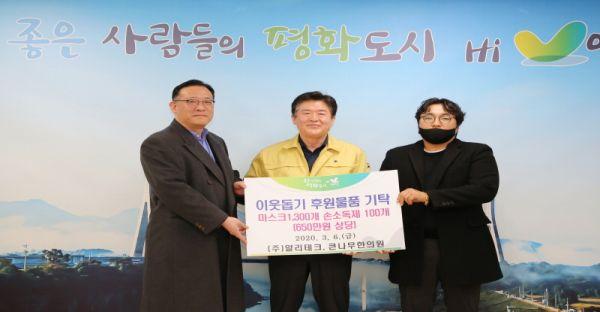 ㈜얄리테크, 큰나무한의원은 6일 연천군청을 방문해 코로나19 예방을 위한 관내 취약계층 어르신에게 지원하고자 마스크 1,300개, 손소독제 100개의 후원물품을 기탁했다.