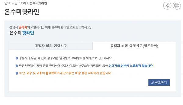 성남시 감사관실 관계자는 “피해자나 신고자의 신분 노출에 대한 불안 요인을 없애 신고를 활성화하려고 이번 시스템을 도입했다”며 “부조리를 막아 청렴한 공직문화를 확산하게 될 것”이라고 말했다.