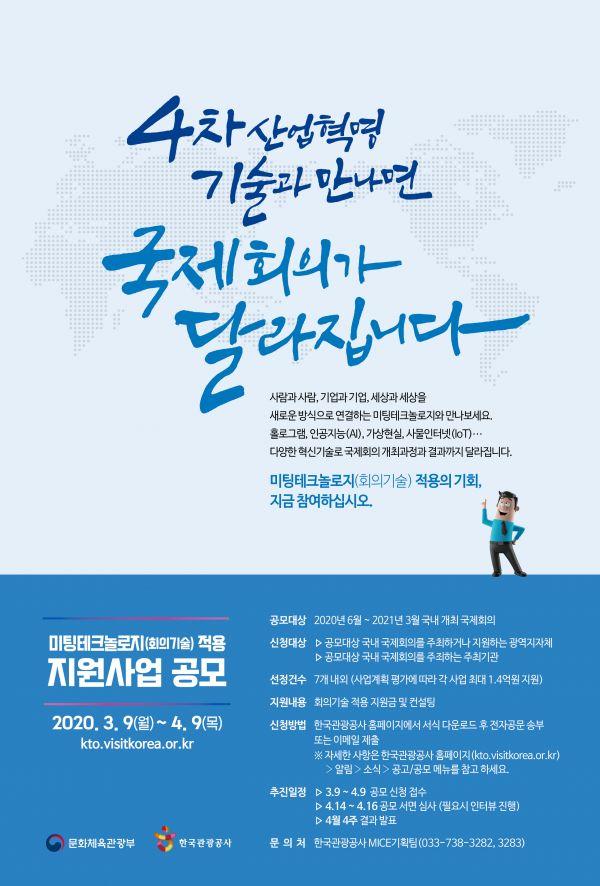 문화체육관광부와 한국관광공사는 성숙기에 접어든 마이스산업의 성장을 촉진하고자 정보통신기술을 활용한 ‘미팅테크놀로지 적용 지원사업’ 공모를 실시한다.