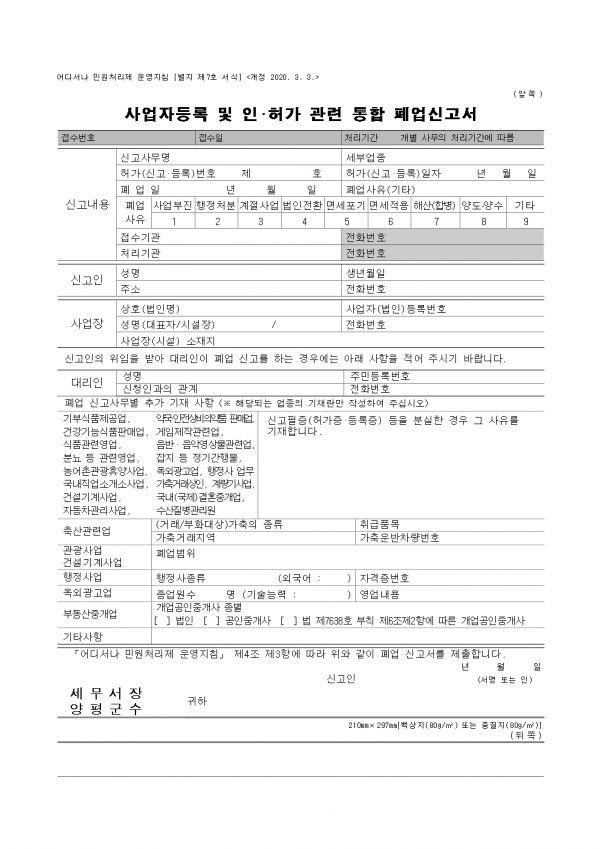양평군은 군민 편의를 위해 사업자등록과 인·허가 폐업을 동시에 할 수 있는 폐업신고 원스톱서비스를 시행하고 있다.