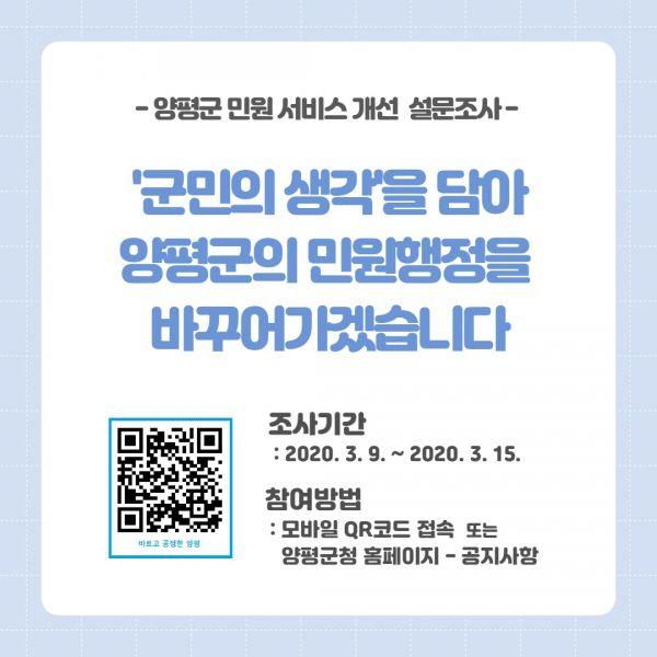 이번 설문조사는 열린 행정과 군민 참여활동의 일환으로 주민의견을 통해 제시된 개선사항을 바탕으로 양평군 특성에 맞는 차별화된 민원서비스를 구축해나갈 계획이라고 전했다.