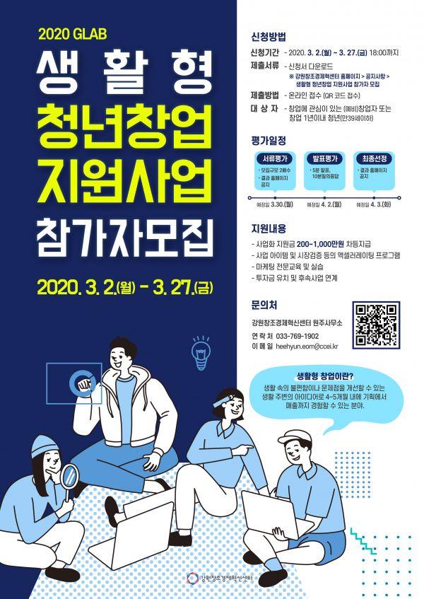 강원창조경제혁신센터가 오는 27일까지 ‘2020 생활형 청년창업가 육성사업’ 참가자를 모집한다고 밝혔다.