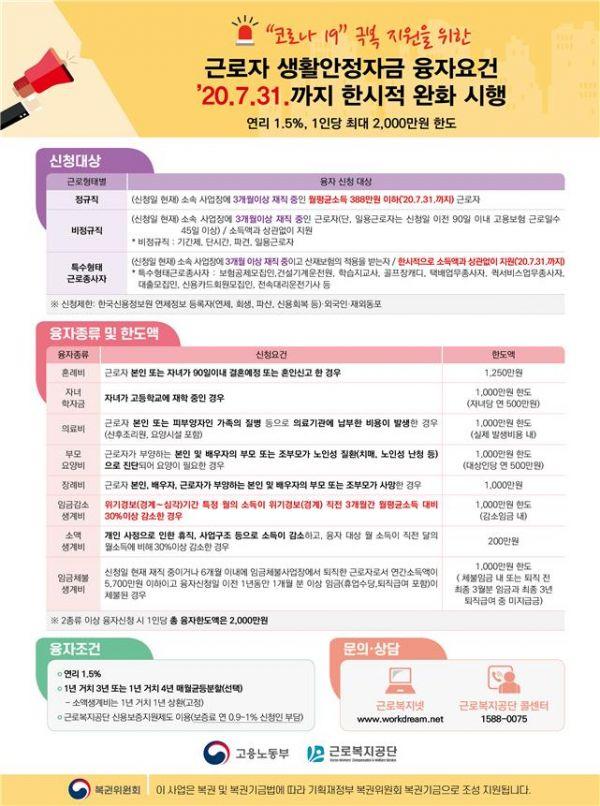 고용노동부와 근로복지공단은 코로나19 확산으로 어려움을 겪고 있는 노동자의 생계 안정을 위해 생활안정자금 융자 소득요건을 한시적으로 월평균소득 259만원 이하 노동자에서 388만원 이하 노동자로 완화하고 지원대상을 18천명으로 확대했다.