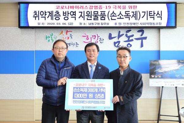 남동구는 지난 6일 인천장애인사회적협동조합으로부터 코로나19 확산 차단을 위한 스프레이형 살균 소독제 300개를 기탁 받았다.