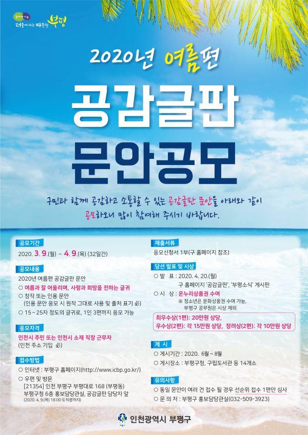 부평구가 오는 4월 9일까지 ‘2020년 여름편 공감글판’ 문안을 공모한다.