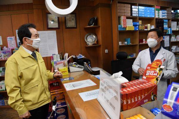 정세균 국무총리는 9일 오전, 공적 마스크를 판매하고 있는 대구 ‘명문약국’을 방문했다.