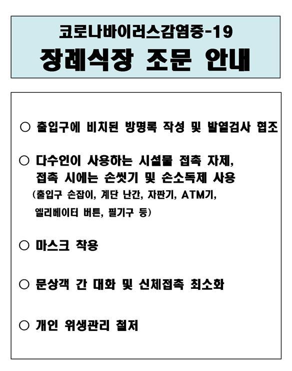 안내문 내용은 방명록 작성 및 발열검사 협조 다수인이 사용하는 시설물 접촉 자제, 접촉 시에는 손씻기 및 손소독제 사용 마스크 착용 문상객 간 대화 및 신체접촉 최소화 개인 위생관리 철저 등이다.