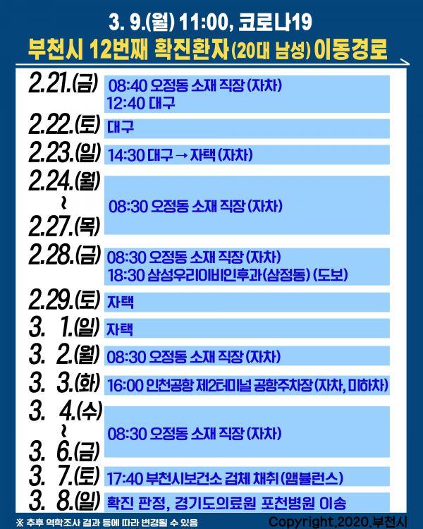 신흥시장 사거리 부근에 거주하는 20대 남성은 2월 21일 08:40 오정동 소재 직장, 12:40 대구 2월 22일 대구 2월 23일 14:30 대구→자택 2월 24일~27일 08:30 오정동 소재 직장 2월 28일 08:30 오정동 소재 직장, 18:30 삼성우리이비인후과 2월 29일 자택 3월 1일 자택 3월 2일 08:30 오정동 소재 직장 3월 3일 오후 4시 인천공항 제2터미널 공항주차장 3월 4일~6일 8:30 오정동 소재 직장 3월 7일 17:40 부천시보건소 검체 채취 3월 8일 확진 판정 후 경기도의료원 포천병원으로 이송됐다.