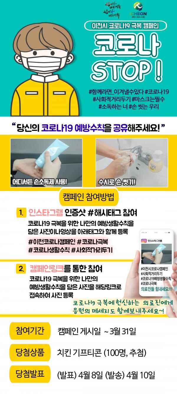 이천시 코로나19 극복 캠페인 ‘코로나 STOP’은 3월 31일까지 나만의 코로나19 예방수칙을 인스타그램 및 캠페인링크 댓글에 공유하는 캠페인이다.