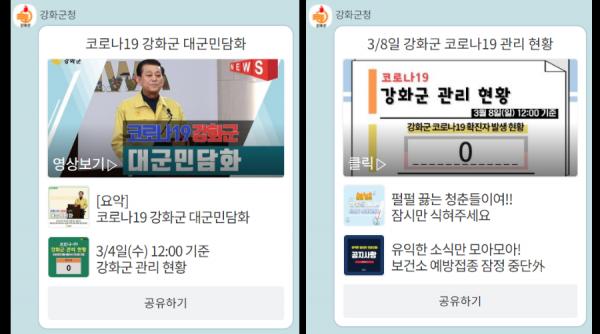 강화군은 카카오톡 채널을 통한 신속하고 정확한 코로나19 대응 정보제공으로 군민들로부터 큰 호응을 얻고 있다.