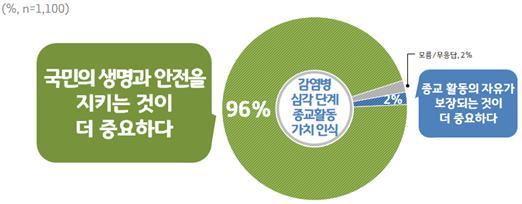 코로나19가 확산되고 있는 감염병 위기경보 ‘심각’ 단계에서의 종교활동과 안전에 대한 물음에는, ‘종교 활동의 자유가 보장되는 것’ 보다 ‘국민의 생명과 안전을 지키는 것이 더 중요하다’는 응답 결과가 나왔다.