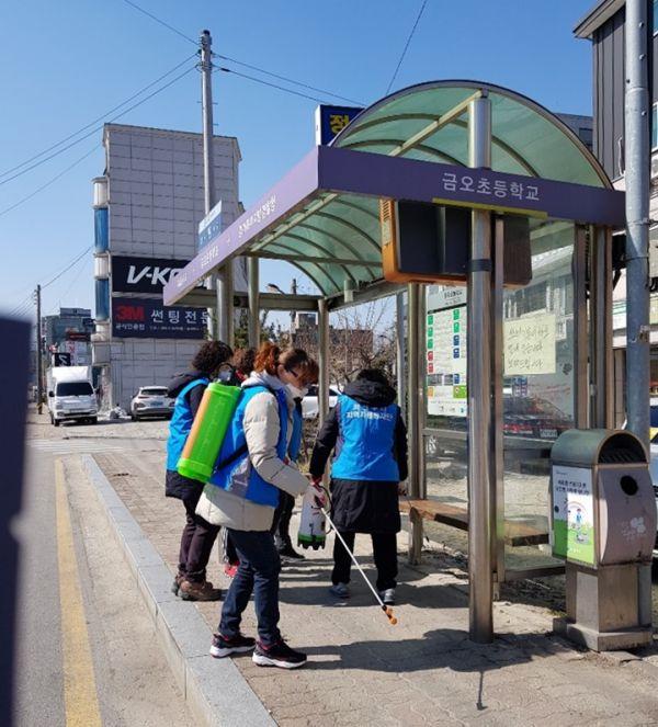 자금동 지역자율방재단은 지난 5일 코로나19 확산방지를 위해 꽃동네에서 의정부성모병원 앞까지 18개 버스정류소에 대한 방역활동을 실시했다.