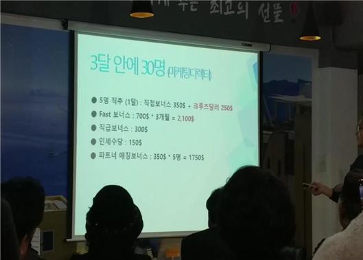 대표는 전국 12곳에 사업설명회장을 만들어 9개월 동안 3,500여명의 하위회원을 가입시키고 수당으로 3억원 상당을 수령한 것으로 드러났다.
