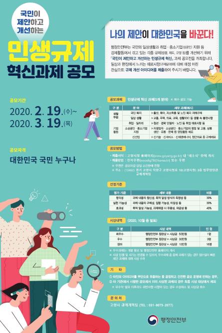 행정안전부가 주관하는 이번 공모는 국민의 일상생활과 취업·중소기업 지원 등 경제활동에서 겪고 있는 각종 불합리한 규제를 찾아 해결하고 개선하려는 취지로 마련됐다.