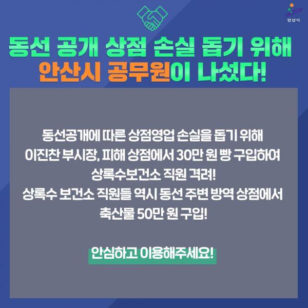 이진찬 부시장은 30만원 상당의 빵을 구입해 일선에서 코로나19 방역에 나서는 상록수·단원보건소 및 재난안전대책본부에 전달했으며 상록수보건소 직원들은 3번째 확진자가 지나간 길에 대한 방역이 실시되면서 이용객이 줄어든 상점 등에서 50만원 상당의 물품을 구매했다.