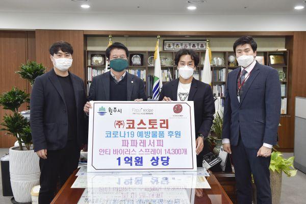 ㈜코스토리는 지난 10일 원주시장 집무실에서 코로나19 예방을 위한 ‘퓨어 미네랄 안티 바이러스 스프레이’ 14,300개를 전달했다.