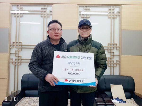 동해시 묵호동의 어달경로당 노인회와 유영순님이 코로나19로 고통 받는 대구 시민들에게 전달해 달라며 성금 700,000원을 묵호동 주민센터에 기탁했다.