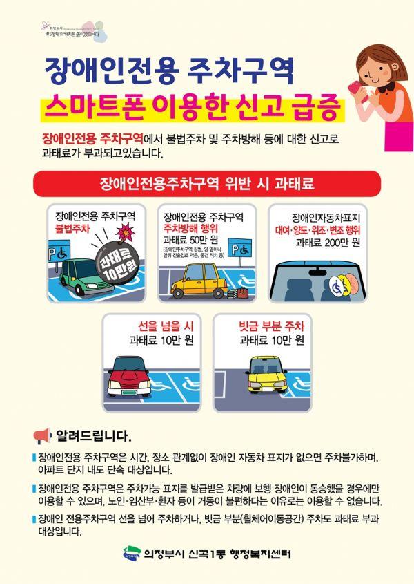 의정부시 신곡1동 행정복지센터는 장애인들이 주차 시 보다 쉽게 이용할 수 있도록 설치된 장애인 전용 주차구역 불법주차를 줄이기 위해 홍수 현수막을 게시하는 등 지속적인 대책을 추진하고 있다.