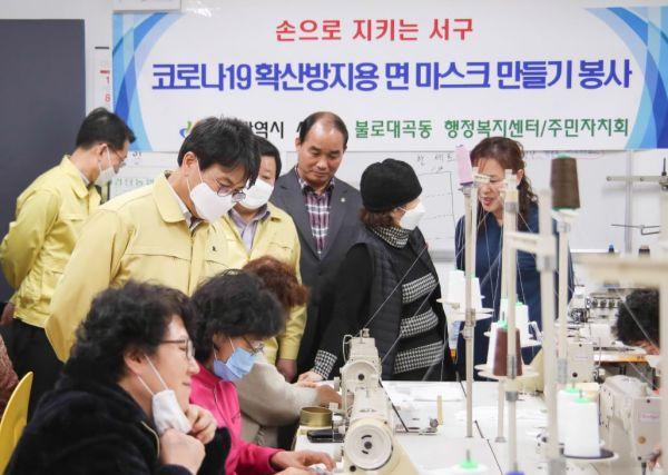 서구는 면마스크 제작에 필요한 재료비와 수리비를 지원하고 서구자원봉사센터를 통해 자원봉사자를 연계하고 있으며 불로대곡동 주민자치회는 동 행정복지센터의 시설을 활용해 면마스크 제작을 함께하고 있다.
