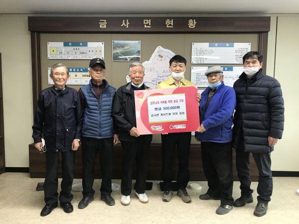 지역 어르신 20명으로 구성된 금사면 게이트볼 회원 일동은 지난 10일 금사면에 코로나19 극복을 위한 성금 50만원을 기탁했다.