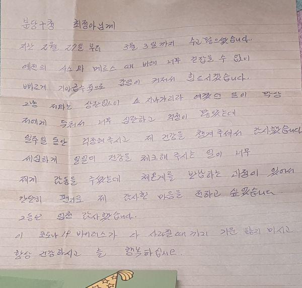 한편 시는 자가격리 대상자와 공무원을 1:1 매칭해 지난 2월 7일부터 매일 건강상태 등에 대해 모니터링을 실시하고 있는 가운데, 3월 10일 자가격리 해제 대상자의 지원 물품을 회수하러 방문한 담당공무원에게 자가격리 당사자였던 시민이 그동한 세심하게 건강을 챙겨주심에 감사하다는 마음을 담아 감사 편지를 전달하기도 했다.