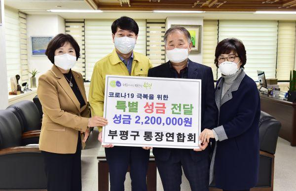 부평구는 지난 10일 구 통장연합회로부터 코로나19로 어려움을 겪고 있는 주민들과 현장에서 고생하는 의료진 및 공무원들을 위해 사용해 달라며 성금 220만원을 기탁 받았다.
