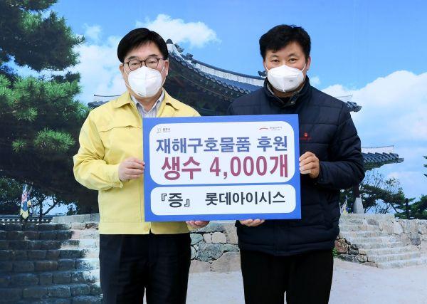 롯데아이시스는 11일 광주시를 방문, 코로나19 확산 방지를 위해 생수 4천개를 기탁했다.