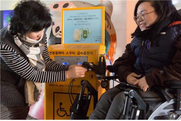 전동휠체어 급속충전기는 휠체어의 전력이 소진되면 이동에 어려움을 겪는 불편을 줄이고자 장애 예술인과 시민의 방문이 많은 서울문화재단 본관 잠실창작스튜디오 남산예술센터 등 3곳에 마련했으며 누구나 무료로 이용할 수 있다.