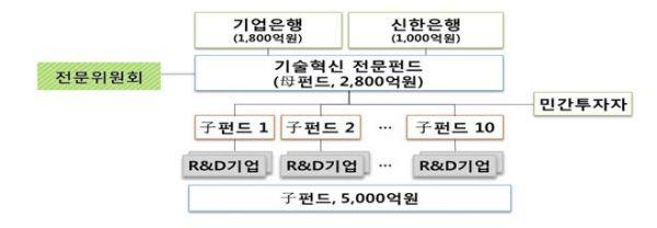 ‘기술혁신전문펀드’는 산업부의 R&D 자금을 예치·관리하기 위해 ‘산업기술자금 전담은행’으로 선정된 기업은행과 신한은행이 총 2800억원 규모를 출자해 母펀드를 조성하고 한국성장금융이 母펀드를 운용하며 민간 투자자의 출자를 더해 총 5,000억원 규모의 子펀드를 결성해 중소·중견기업의 기술혁신활동에 투자하는 방식이다.