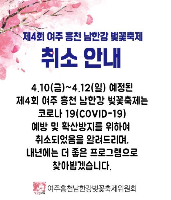 여주시 흥천면은 오는 4월 10일부터 12일까지 제4회 여주흥천남한강벚꽃축제를 개최하려고 했으나, 코로나 19의 경로불확실 감염 차단을 위해 벚꽃축제를 부득이 취소하게 됐다.