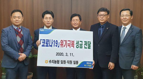 이날 수지농협 관계자 5명도 수지구청을 방문해 코로나19로 어려움을 겪는 저소득 가정을 위해 써 달라며 성금 238만원을 전했다.