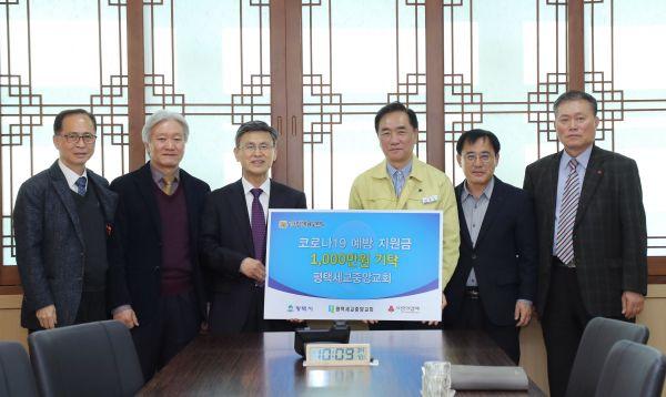 평택시 세교동에 위치한 평택세교중앙교회는 11일 코로나19가 확산하고 있는 가운데, 평택지역 코로나19 극복을 위한 방역물품 구입에 써 달라며 성금 1천만원을 기탁했다.