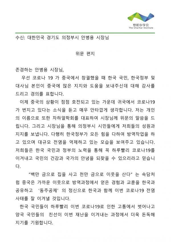 의정부시는 지난 6일 중국 차하얼학회 한팡밍 회장으로부터 코로나바이러스 감염증-19 확산과 관련, 감사와 위로가 담긴 공식서한을 받았다.