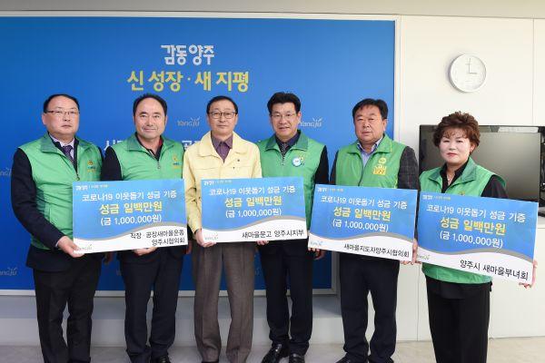 새마을운동양주시지회 산하단체장들은 “이번 성금이 코로나19 사태로 인해 생활에 어려움을 겪는 취약계층에게 조금이나마 도움이 됐으면 좋겠다”며 “하루빨리 코로나19가 종식돼 시민들의 생활이 안정되길 기원한다”고 말했다.
