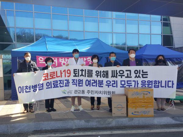 이천시 관고동 주민자치위원회는 지난 11일 코로나19 선별진료소로 찾아가 고군분투하고 있는 경기도의료원 이천병원 의료진을 위해 100만원 상당, 면 티셔츠와 자치위원들이 기증한 치약, 타올 등을 전달하고 이천 시민을 위해 고생하는 의료진을 격려했다고 밝혔다.